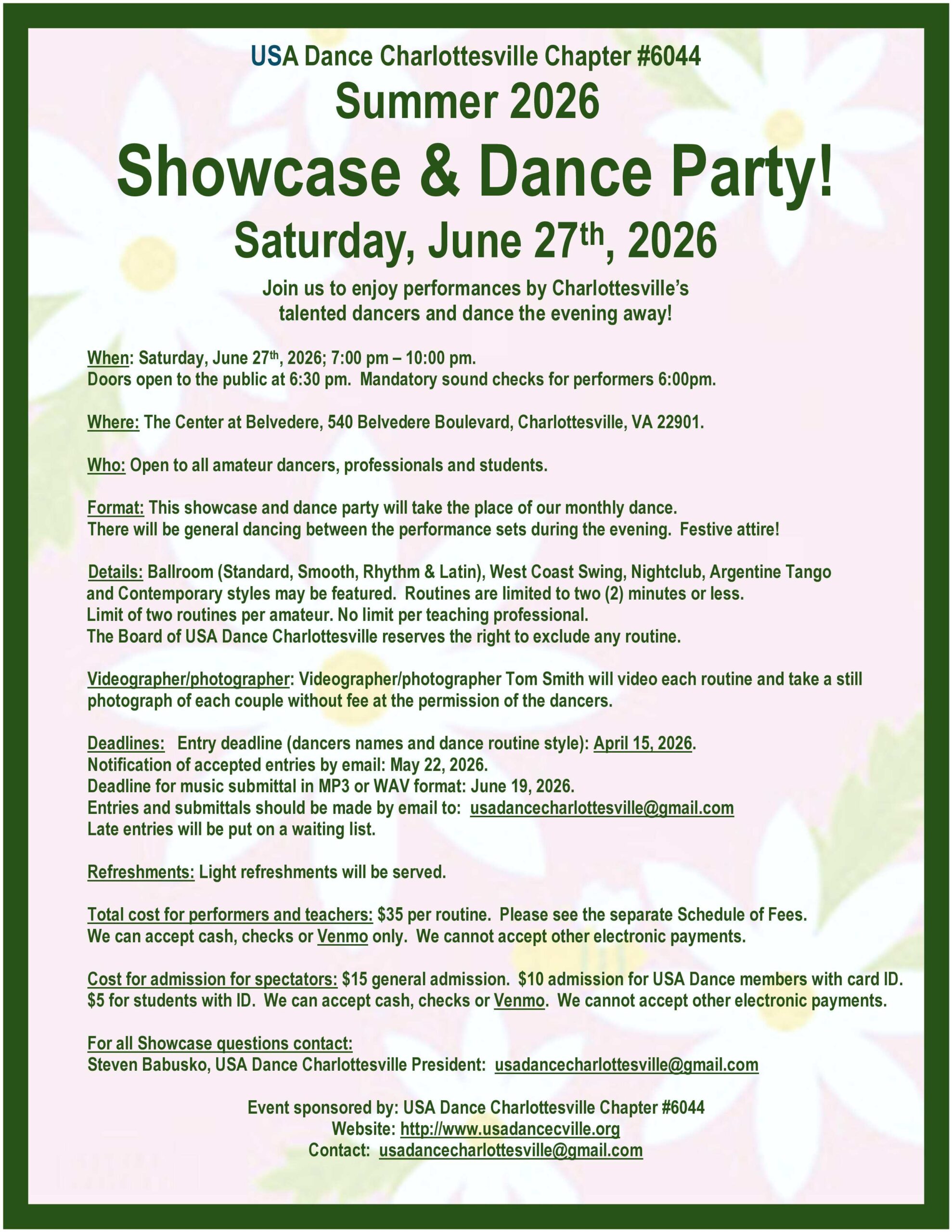 Join us at The Center for our June Showcase! See routines by local professional and amateur dancers. Enjoy social dancing between the sets. Light refreshments will be served.